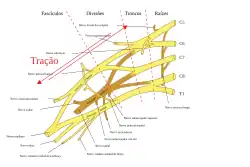 A tração ocorre em um movimento forte e provoca uma tensão entre os nervos. Existem dois tipos de tração: para baixo ou para cima. Na tração descendente há uma tensão do braço, que obriga o ângulo do pescoço e ombro a tornar-se mais largo. Essa tensão é forçada e pode causar lesões das raízes superiores e do tronco dos nervos do plexo braquial. A tração para cima também resulta na ampliação do ângulo de pescoço e ombro, mas desta vez os nervos T1 e C8 são arrancados.[16]