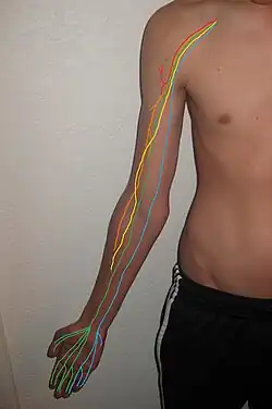 - ↑ Hems, T. E. J.; Mahmood, F. (2012). «Injuries of the terminal branches of the infraclavicular brachial plexus: Patterns of injury, management and outcome». The Bone & Joint Journal. 94–B (6): 799–804. PMID 22628595. doi:10.1302/0301-620X.94B6.28286