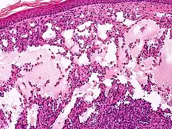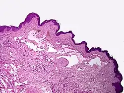 Microscopicamente, as vesículas em um linfangioma circunscrito são canais linfáticos dilatados expandindo a derme papilar. Eles podem ser associados com acantose e hiperqueratose. Há muitos canais na derme superior, muitas vezes se estendendo para o tecido subcutâneo (a camada mais profunda da derme, contendo gordura e tecido conjuntivo). Os vasos mais profundos têm grande calibre com paredes espessas que contêm musculatura lisa. O lúmen é preenchido com fluido linfático, mas muitas vezes contém glóbulos vermelhos, linfócitos, macrófagos, e neutrófilos. Os canais são revestidos com células endoteliais planas. O interstício tem muitas células linfóides e mostra evidência de fibroplasia (a formação de tecido fibroso). Nódulos (uma pequena massa de tecido ou agregação de células) em linfangiomas cavernosos são grandes canais, irregulares, na derme reticular e tecido subcutâneo que são revestidos por uma camada única de células endoteliais e uma camada incompleta de músculo liso. O estroma é constituído por tecido conjuntivo frouxo com uma grande quantidade de células inflamatórias. Estes tumores geralmente penetram a musculatura. O higroma cístico é histologicamente indistinguível de um linfangioma cavernoso. [7]