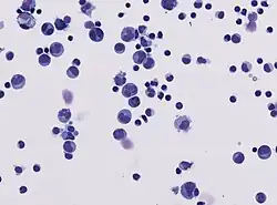 Linfoma de células do manto, um tipo de linfoma não Hodgkin, onde se observa os contornos irregulares do núcleo das células do linfoma