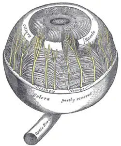 | A coroide e íris (o músculo ciliar é marcado perto da parte superior.) | |