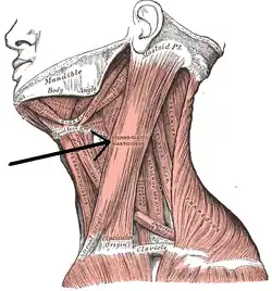 Região ântero-lateral do pescoço com músculo esternocleidomastoideu assinalado (seta)