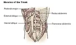 Além disso, a flexão lateral e a rotação do tronco são propiciadas pela contração unilateral dos músculos oblíquos externo e interno do abdome.[2][1]