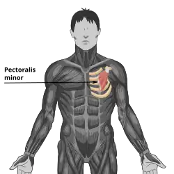 O músculo peitoral menor (do latim, pectus, osso do peito, tórax) é profundo ao músculo peitoral maior. Suas inserções proximais vão da terceira à quinta costelas, e a inserção distal é no processo coracoide da escápula. A ação dele é estabilizar, deprimir e inclinar anteriormente a escápula, bem como elevar as costelas 2-5 participando assim na respiração forçada.[1] Sendo inervado pelo nervo peitoral medial.