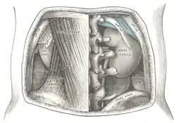 Vista posterior, próximo aos rins. (O músculo é visto à esquerda, embaixo)