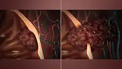 O tumor maligno (R) se espalha de forma incontrolável e invade o tecido circundante, ao contrário do tumor benigno (L), que permanece fechado do tecido vizinho.