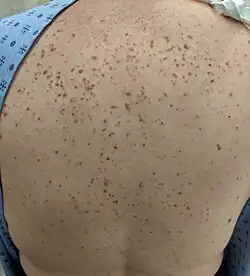 A mastocitose cutânea difusa tem envolvimento difuso no qual todo o tegumento pode ser espessado e infiltrado com mastócitos para produzir uma cor laranja peculiar, dando origem ao termo "homem laranja". A mastocitose cutânea em crianças geralmente se apresenta no primeiro ano após o nascimento e, geralmente, desaparece durante a adolescência. [5]