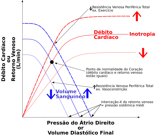 Diagrama ilustrando o mecanismo de Frank-Starling no coração. O eixo y frequentemente descreve o volume sistólico, o trabalho sistólico ou o débito cardíaco. O eixo x frequentemente descreve o volume diastólico final ou a pressão atrial direita. As três curvas demonstram que deslocamentos ao longo da mesma linha indicam uma mudança na pré-carga, enquanto que deslocamentos de uma linha para outra indicam uma mudança na pós-carga ou na contratilidade do cardiomiócito. Um aumento no volume sanguíneo causaria um deslocamento ao longo da linha para a direita, o que aumenta o volume de final de diástole do ventrículo esquerdo (eixo x) e, portanto, também aumenta o volume sistólico (eixo y). A ionotropia se refere à força de contração do cardiomiócito.