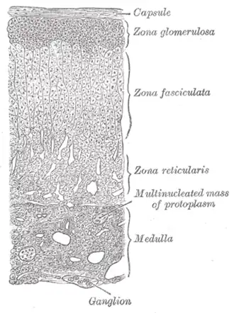 A medula da suprarrenal apresenta dois tipos celulares: as células cromafins e as células ganglionares. Quando corada em H+E, a medula da suprarrenal é composta por cordões de células com citoplasma ligeiramente basófilo e granular e com numerosos capilares, no estroma. Os canais venosos que drenam os sinosóides do córtex passam através da medula em direção à veia medular central.