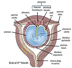 As membranas fetais envolvem o embrião em desenvolvimento e formam a interface materno-fetal.[3] As membranas fetais são derivadas da camada trofoblástica (camada externa de células) formada durante a implantação do blastocisto.[3] A camada trofoblástica diferencia-se em âmnio e cório, que neste momento formam as membranas fetais.[4] O âmnio é a camada mais interna e, por isso, está em contacto com o líquido amniótico, o feto e o cordão umbilical.[5] A pressão interna do líquido amniótico faz com que o âmnio fique ligado passivamente ao cório.[4] O cório funciona separando o âmnio da decídua e do útero maternos.[4] A placenta desenvolve-se a partir do cório do embrião e dos tecidos uterinos da mãe.