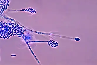 Microfotografia mostrando conidióforos e conídias do fungo Fusarium verticillioides.[1]