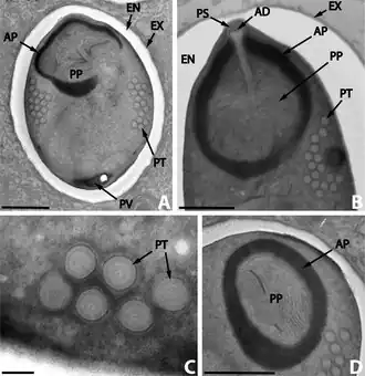 A metade anterior do esporo contém um aparelho semelhante a um arpão, com um longo filamento polar em forma de fio, que é enrolado na metade posterior do esporo. A parte anterior do filamento polar é circundada por um polaroplasto, uma lamela de membranas. Atrás do filamento polar existe um vacúolo posterior.[18]