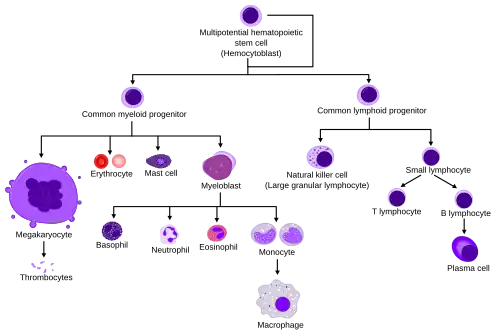 - ↑ Kawamoto H, Minato N (2004). «Myeloid cells». The International Journal of Biochemistry & Cell Biology. 36 (8): 1374–1379. PMID 15147715. doi:10.1016/j.biocel.2004.01.020