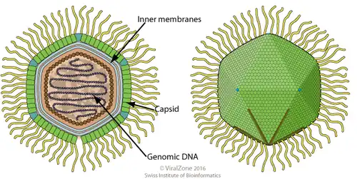 Através de microscopia eletrônica, nota-se que ele tem forma hexagonal, portanto seu capsídeo tem simetria icosaédrica,[3] o que sugere que o vírus não sai da célula parasitada através de exocitose.[4]