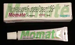 Mometasona é um fármaco utilizado pela medicina como corticosteroide de média potência em rinites, e alta potência exudativa anti-inflamatória em dermatoses e dermatites. O fármaco induz a produção de proteínas inibidoras da fosfolipase A2.[1][2]
