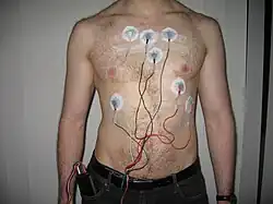 Um monitor Holter e seus eletrodos aplicados em um paciente