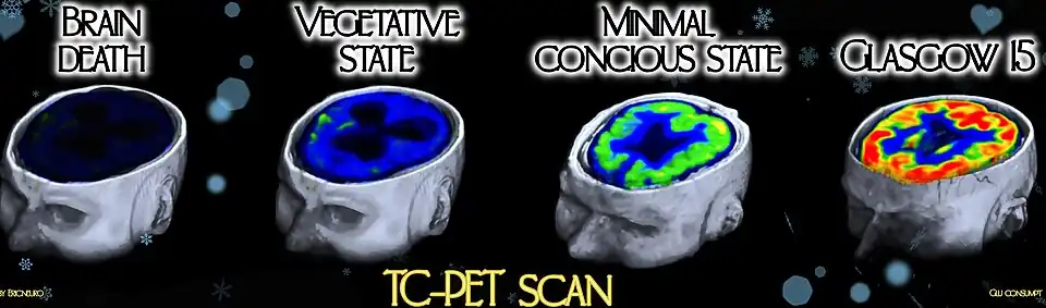 - O PET-SCAN consiste da associação de cintilografia e tomografia multislice com mais de 36 canais de emissão de raios x e recepção, com este hardware é possível realizar exames tanto anatômicos como funcionais do encéfalo, além de permitir a manipulação das imagens e reconstruções pormenorizadas. A técnica mais empregada no diagnóstico de morte encefálica consiste na utilização de Tecnécio 99 que permite visualizar o consumo de glicose no parênquima encefálico.