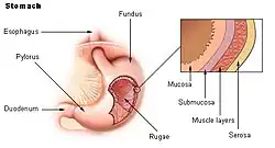 Mucosa gástrica é a camada interna do estômago, responsável pela secreção de sucos gástricos e proteção contra auto-digestão. Nos humanos, mede cerca de 1 mm de espessura, com superfície lisa e aveludada, formada por epitélio colunar simples, lâmina própria e muscularis mucosae.«Physiology, Stomach». StatPearls - NCBI Bookshelf. Consultado em 3 de novembro de 2025