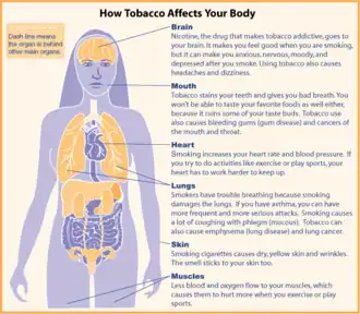 Segundo os Centros de Controle e Prevenção de Doenças dos EUA, o fumo de cigarros é a principal causa de mortes evitáveis nos Estados Unidos e gera custos econômicos substanciais relacionados à saúde na sociedade.[35] Durante o período de 1995 a 1999, o fumo resultou em aproximadamente 440.000 mortes prematuras por ano e cerca de US$ 157 bilhões em perdas econômicas relacionadas à saúde.[36] Sabe-se que o fumo aumenta o risco de, e está ligado a, uma série de efeitos adversos à saúde, por exemplo: "O fumo de cigarros é responsável por cerca de um terço de todos os casos de câncer, incluindo 90 percentual dos casos de câncer de pulmão. [O fumo também] causa doenças pulmonares como bronquite crônica e enfisema, [e pode] aumentar o risco de doenças cardíacas, incluindo acidente vascular cerebral, infarto, doenças vasculares e aneurisma."[37]