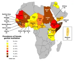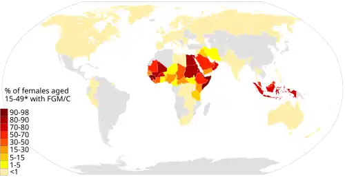 De acordo com os dados disponíveis, a mutilação genital feminina (MGF) é praticada em cerca de 28 países de África , e em muitos outros no Oriente Médio e na Ásia, bem como várias comunidades de imigrantes na Europa, Américas e Austrália.[51] Um folheto da UNICEF datado de 2016 estima que 200 milhões de mulheres em 30 países sofreram MGF, e salienta que desse número mais de metade dos casos se referem a apenas 3 paísesː Indonésia, Egipto e Etiópia. A organização considera-a uma "preocupação global". Anota também que embora haja um declínio da prática, é insuficiente para acompanhar o aumento do crescimento populacional, pelo que, mesmo a manter-se a tendência , o número de casos de MGF aumentará durante os próximos quinze anos.[3]