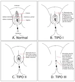 Em pessoas nascidas com o sexo feminino, a mutilação pode ter vários graus e maneiras. A extirpação do clítoris é chamada de clitoridectomia; pode ser acompanhada da eliminação de parte ou de todo o lábio vaginal, procedimento chamado excisão. Há uma forma de mutilação – infibulação – mais grave que consiste na costura dos lábios e do clítoris, impedindo a menstruação e frequentemente levando à morte da pessoa afetada. Algumas comunidades islâmicas e outras não-islâmicas do norte da África, Oriente Médio e Indonésia praticam a mutilação genital feminina e vêm chamando a atenção do mundo ocidental por conta disso. São relatados também casos de mutilação genital feminina em comunidades expatriadas em todo o mundo