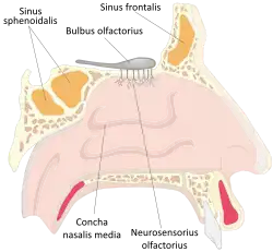Existem pequenas células receptoras do olfato localizadas na parte superior da cavidade nasal com nervos olfatórios que se estendem diretamente até o interior do cérebro.[1]