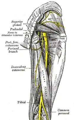 É o maior nervo da bifurcação do nervo ciático em tibial (medial) e nervo fibular comum (lateral). Compõe a fossa poplítea (região posterior do joelho). Desce medialmente à fíbula; passa posteriormente ao maléolo medial e termina no retináculo dos músculos flexores onde se divide em nervo plantar lateral e medial.[1]