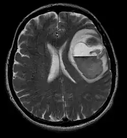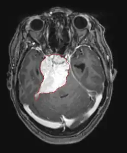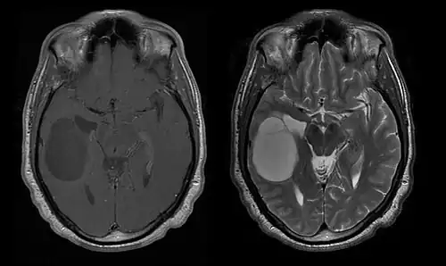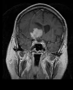 Na ressonância magnética, um tumor intracraniano aparece como uma lesão maciça que pode se tornar mais luminescente após o uso do agente de contraste. No entanto, há sempre uma anomalia de sinal na ressonância magnética, que indica a presença de neoplasia ou edema vasogênico. Normalmente, o aumento da luminescência (realce pelo contraste) é indicativo de um tumor de grau mais alto de malignidade. Um anel contrastante é característico do glioblastoma, com a porção luminescente correspondendo à parte vital do tumor maligno e a área mais escura-hipointense à necrose tecidual.
