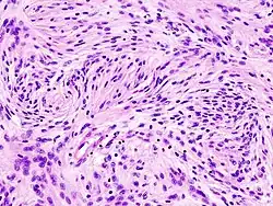 Os tumores de células gliais mais comuns e malignos são os glioblastomas. Consistem em uma massa heterogênea de células de astrocitoma pouco diferenciadas principalmente em adultos. Geralmente ocorrem nos hemisférios cerebrais, mais raramente no tronco cerebral ou na medula espinhal. Exceto em casos muito raros, como todos os tumores cerebrais, eles não se estendem além das estruturas do sistema nervoso central.