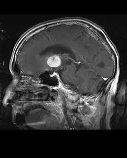 Os pacientes com meningioma podem apresentar sintomas típicos de uma lesão craniana maciça, incluindo convulsões e déficits neurológicos focais. Como o meningioma também pode ser assintomático, às vezes eles são detectados na tomografia computadorizada e na ressonância magnética por outros motivos. Este tumor de ressonância tem uma aparência característica, geralmente consistindo em realce uniforme de contraste ao longo da dura-máter com separação clara do parênquima cerebral. Outra característica, embora não presente em todos os casos, é a chamada "cauda dural", representada por uma protuberância que se estende além da lesão e indica o ponto de ancoragem na dura-máter.