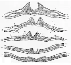 As células ectodérmicas da linha média, por sinalização do mesoderma dorsal subjacente, tornam-se colunares, enquanto que as células destinadas a formar a epiderme se tornam mais achatadas. Esse alongamento das células ectodérmicas dorsais causa a elevação das regiões neurais acima da ectoderma circundante, formando assim a placa neural. As células da ectoderme circundante vão originar a epiderme.