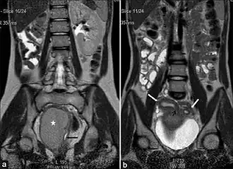 | (a) Imagem coronal de T2W de tomada única mostra ausência do rim direito. A hemivagina distendida (asterisco) é vista no lado direito e a hemivagina esquerda normal colapsada com fluido mínimo é vista adjacente a ela (seta preta). A hemivagina distendida termina acima do introito e seu conteúdo é hipointensa à gordura. (b) Imagem coronal de T2W de tomada única mostra os cornos uterinos direito e esquerdo (setas brancas). A cavidade do corno uterino direito é vista se comunicando com a extremidade superior da coleção de fluido na hemivagina direita (pequena seta preta). | |
