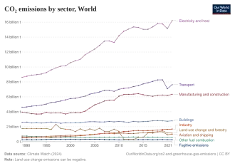 - ↑ Ritchie, Hannah; Roser, Max; Rosado, Pablo (11 de maio de 2020). «CO₂ and Greenhouse Gas Emissions». Our World in Data
