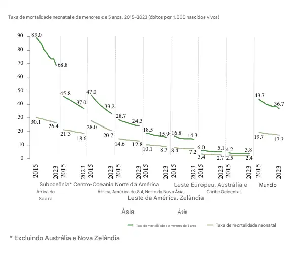 Em 2023, o número de mortes globais de crianças menores de 5 anos foi de 4,8 milhões, uma queda em relação aos 10,1 milhões em 2000 e aos 6,2 milhões em 2015. A taxa de mortalidade infantil caiu para 37 mortes por 1.000 nascidos vivos, o que representa uma redução de 52% desde 2000 e de 16% desde 2015. Da mesma forma, a taxa de mortalidade neonatal caiu para 17 mortes por 1.000 nascidos vivos em 2023 – uma diminuição de 44% desde 2000 e de 12% desde 2015. Atingir as metas relacionadas aos Objetivos pode salvar 8 milhões de vidas até 2030.[3]