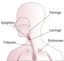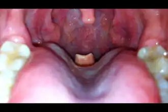 | Epiglotite, visível aqui como um branco no fundo da garganta. | |