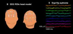 - ↑ Frohlich, Joel; Senturk, Damla; Saravanapandian, Vidya; Golshani, Peyman; Reiter, Lawrence; Sankar, Raman; Thibert, Ronald; DiStefano, Charlotte; Huberty, Scott; Cook, Edwin; Jeste, Shafali (dezembro de 2016). «A Quantitative Electrophysiological Biomarker of Duplication 15q11.2-q13.1 Syndrome». PLOS ONE. 11 (12). Bibcode:2016PLoSO..1167179F. PMC 5157977