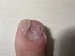 A destruição constante do leito ungueal leva à onicodistrofia, paroníquia[5] e escurecimento da unha.[6]