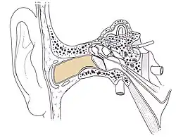 A orelha média é um espaço no osso temporal preenchido com ar,[2] situado entre a membrana do tímpano e as estruturas da orelha interna.[8] É composta pelos ossículos martelo, bigorna e estribo, denominados dessa forma por sua semelhança conspícua com esses objectos,[3][9] e pela tuba auditiva ou trompa de Eustáquio.