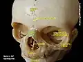 ![]() Ossos nasais ao centro, entre os maxilares, abaixo do frontal e acima da fossa nasal (em rosa). | |