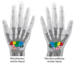![]() Proximal: A=Escafoide, B=Semilunar, C=Piramidal, D=Pisiforme Distal: E=Trapézio, F=Trapezóide, G=Capitato, H=Hamato | |