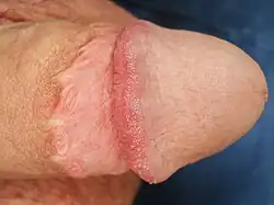 - Pápulas penianas peroladas são protuberâncias de cor um pouco mais claras ao redor da base (sulco) da glande, que normalmente se desenvolvem em homens com idade entre 20 e 40 anos. Em 1999, diferentes estudos haviam produzido estimativas de incidência variando de 8 a 48% de todos os homens.[25] Eles podem ser confundidos com verrugas, mas não são prejudiciais ou infecciosos e não requerem tratamento.[26]