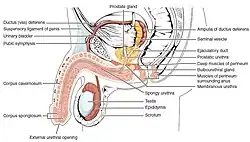 A uretra, é a última parte do tracto urinário, atravessa o corpo esponjoso, e a sua abertura, conhecida como o meato ureteral, situa-se sobre a ponta da glande do pénis. É uma passagem tanto para a urina quanto para a ejaculação do sêmen. Os espermatozoides são produzidos nos testículos e armazenados no epidídimo anexado. Durante a ejaculação, os espermatozoides são impulsionados pelos canais deferentes, dois ductos que passam por cima e por trás da bexiga. Os fluidos são adicionados pelas vesículas seminais e os vasos deferentes transformam-se nos ductos ejaculatórios, que se unem à uretra dentro da próstata. Tanto a próstata quanto as glândulas bulbouretrais adicionam mais secreções e o sêmen é expelido pelo pénis.