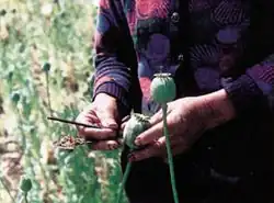 A colheita tradicional das papoulas do ópio para a produção de opiáceos envolvia o trabalho intensivo de fazer cortes rasos nos frutos imaturos (vagem de semente) para que o látex vazasse e secasse e, em seguida, retornar no dia seguinte para raspar o látex seco, conhecido como ópio bruto.