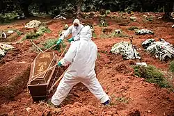 Até 22 de fevereiro de 2026, 7 111 504 mortes foram atribuídas à COVID-19.[15][12] A primeira morte confirmada foi em Wuhan em 9 de janeiro de 2020.[116] Esses números variam por região e ao longo do tempo, influenciados pelo volume de testes, qualidade do sistema de saúde, opções de tratamento, resposta do governo,[117] tempo desde o surto inicial e características da população, como idade, sexo e saúde geral.[118]