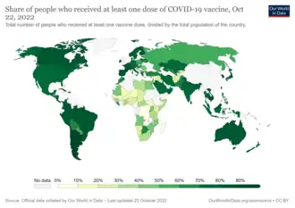 A pandemia de COVID-19, também conhecida como pandemia de coronavírus, é uma pandemia da doença por coronavírus 2019 (COVID-19), causada pelo coronavírus da síndrome respiratória aguda grave 2 (SARS-CoV-2). O vírus foi identificado pela primeira vez a partir de um surto em Wuhan, China, em dezembro de 2019.[20][21][22] As tentativas de contê-lo falharam, permitindo que o vírus se espalhasse para outras áreas da China e, posteriormente, para todo o mundo. Em 30 de janeiro de 2020, a Organização Mundial da Saúde (OMS) classificou o surto como Emergência de Saúde Pública de Âmbito Internacional (PHEIC) e, em 11 de março de 2020, como pandemia. A OMS declarou o fim da PHEIC no dia 5 de maio de 2023,[11][23] apesar de ainda continuar a se referir a ela como uma pandemia.[24] Até 22 de fevereiro de 2026, conforme a OMS, 779 056 637 casos foram confirmados em 233 países e territórios,[12] com 7 111 504 mortes atribuídas à doença, tornando-se a quinta mais mortal da história.
