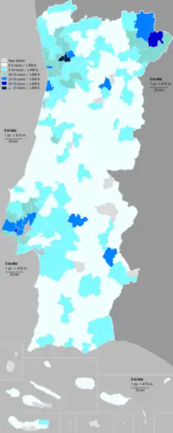 ![]() Mapa dos municípios com casos de COVID-19 em 26 de outubro de 2020, durante a segunda vaga da pandemia em Portugal