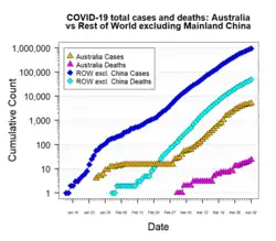 - ↑ «WA man becomes first Australian to die from coronavirus». 7 News. 1 de março de 2020. Consultado em 1 de março de 2020. Cópia arquivada em 1 de março de 2020