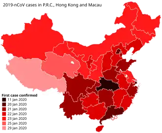 No entanto, a resposta tardia e controversa das autoridades de Wuhan e Hubei não conseguiu conter o surto no estágio inicial, o que levou a críticas do público e da mídia.[71] Em 29 de janeiro, o vírus havia se espalhado para todas as províncias da China continental.[72][73][33]