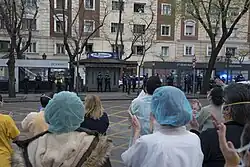 Até 3 de abril, cerca de 10% dos casos são de profissionais de saúde.[212] Uma causa de infecção é a falta de equipamento de proteção adequado, levando alguns profissionais de saúde a fabricar seu próprio equipamento improvisado. Segundo Fernando Simón, apenas 8,8% dos profissionais de saúde diagnosticados necessitam de hospitalização, em contraste com 40% dos outros casos da doença.[213][214] Doze enfermeiros e médicos sucumbiram à doença.[215]