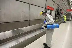 Em 23 de março de 2020, havia 240.245 policiais[186] e mais de 2.500 militares destacados em todo o país.[187] Alguns policiais fizeram viagens a populações em quarentena e tocaram música.[188] Em 24 de março, o governo assumiu o controle de casas de repouso privadas em todo o país e anunciou uma investigação judicial depois que as tropas encontraram pacientes em casas de repouso que haviam morrido de COVID-19 deixados mortos em suas camas.[189] Em Madri, os hospitais recusaram transferências de lares de idosos e uma pista de patinação foi usada para armazenar cadáveres enquanto o necrotério da cidade transbordava.[189] Em 31 de março, a polícia havia emitido 100.000 citações e prendido 1.000 pessoas por violar os regulamentos de distanciamento social. As multas podem variar de 100 a 30.000 euros por violações graves ou até quatro meses de prisão.[190][191] Drones são usados para aplicação. A polícia também montou 30.000 barreiras para impedir que as pessoas viajem.[192] Em 10 de abril, 3.000 motoristas foram sancionados por violar a quarentena, enquanto milhares eram parados todos os dias.[193]